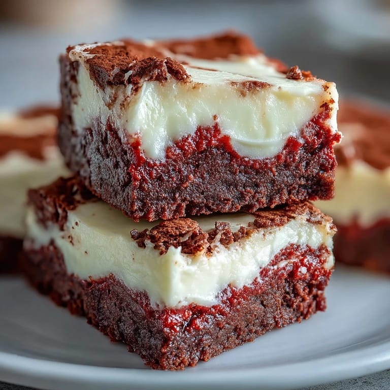 Save to Pinterest The first time I made these, I panicked because the cheesecake layer looked too pale next to the vibrant red. But after baking, the contrast was exactly what made them stunning. My neighbor spotted them cooling on the counter through the window and knocked on the door to ask what smelled so good. I handed her a square still warm from the oven, and she declared it the best brownie she'd ever tasted.